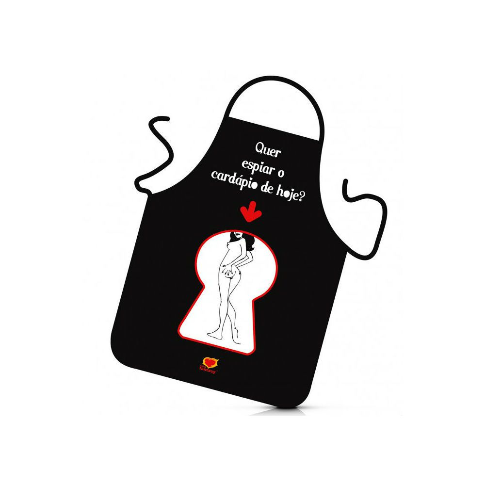 Avental erótico confeccionado em tecido acetinado com a frase "Quer Espiar o Cardápio de Hoje?" e imagem de uma mulher nua. Com alça para passar atrás do pescoço e tiras para amarrar nas costas. Mede aproximadamente 72 cm de comprimento por 47 cm de largura, vestindo do tamanho P ao G. Tem impressão em Silk-Scren, com tinta plástica, que proporciona maior durabilidade à peça, podendo ser lavado tranquilamente em lavadouras de roupas. Uma gostosa brincadeira. Ideal para presentear em despedidas de solteiros e amigo da onça, para ser usado em festas liberais, carnaval ou como um delicioso convite ao parceiro (a).