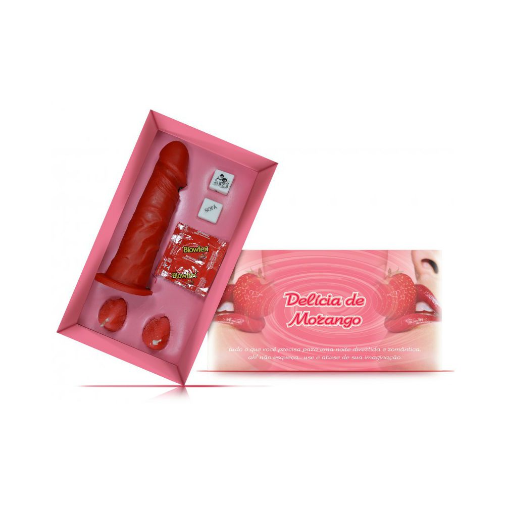 Este produto é um Kit Delícia de Morango, contendo 01 pênis realístico de 15,3 x 4 cm com aroma de morango; 01 preservativo com aroma de morango; 01 jogo de dados; 02 velas em formato e aroma de morango. Tudo o que você precisa para uma noite inesquecível e romântica!