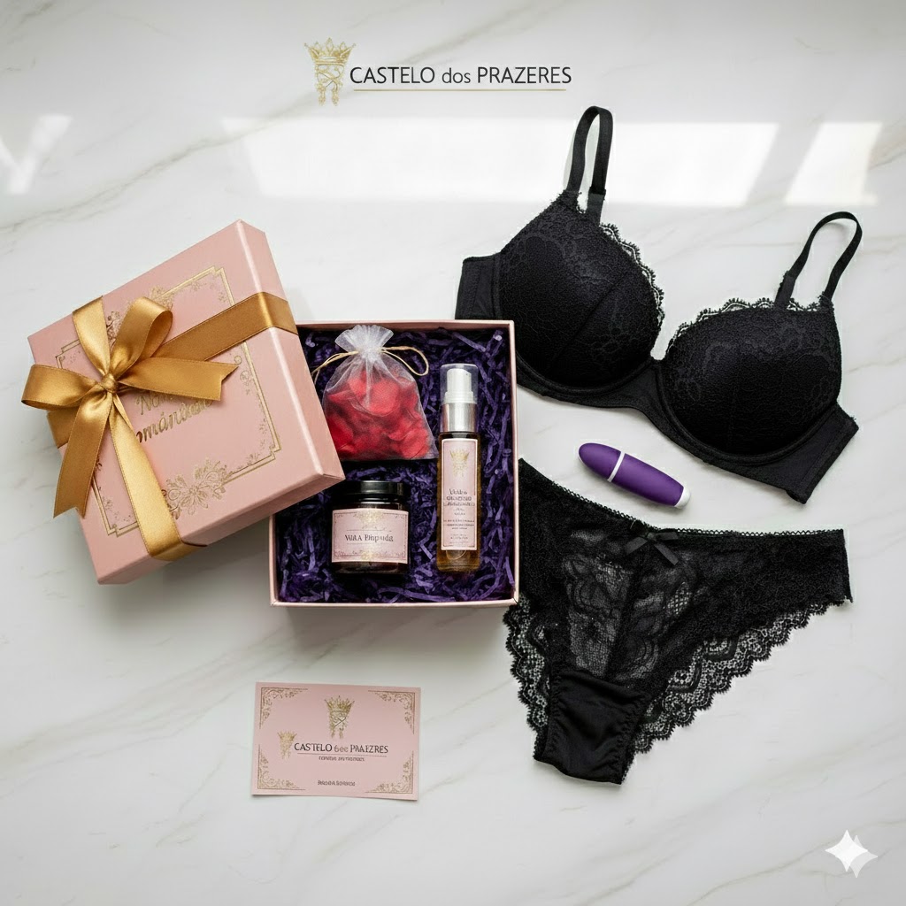Kits Personalizados: Você escolhe os itens (Lingerie + Acessório + Cosmético) e nós montamos uma embalagem de presente impecável e discreta.
