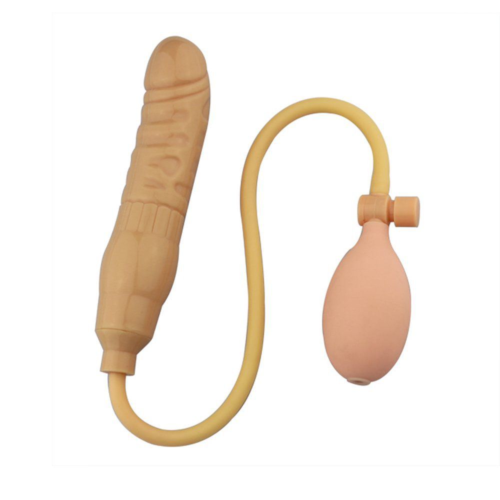 Pênis inflável com glande saliente e relevos estimulantes em formato de veias. Possui uma bomba de pressão manual e um botão para liberação do ar.